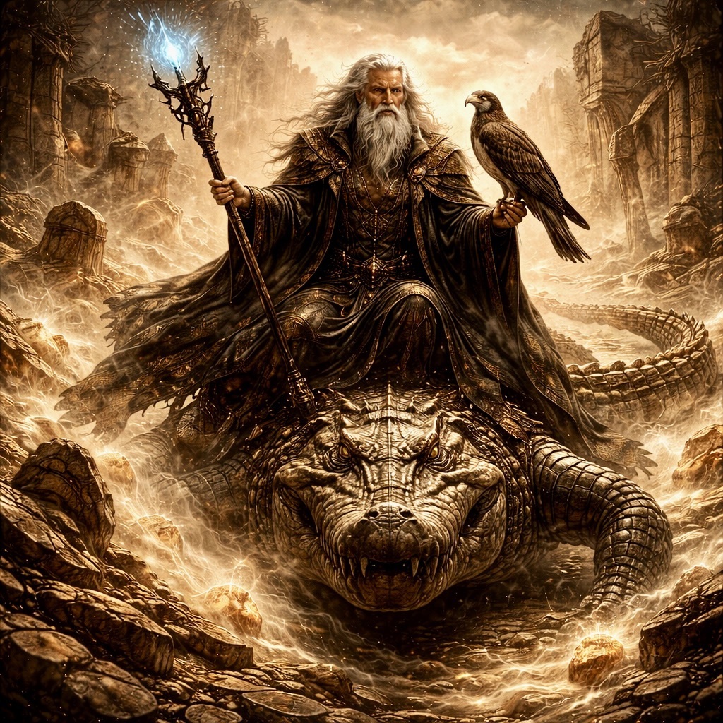 The old man riding the crocodile suggests control over time and instinct. The hawk suggests clarity and vision. Together, they form a figure that understands both the past and the present, both the seen and the unseen.