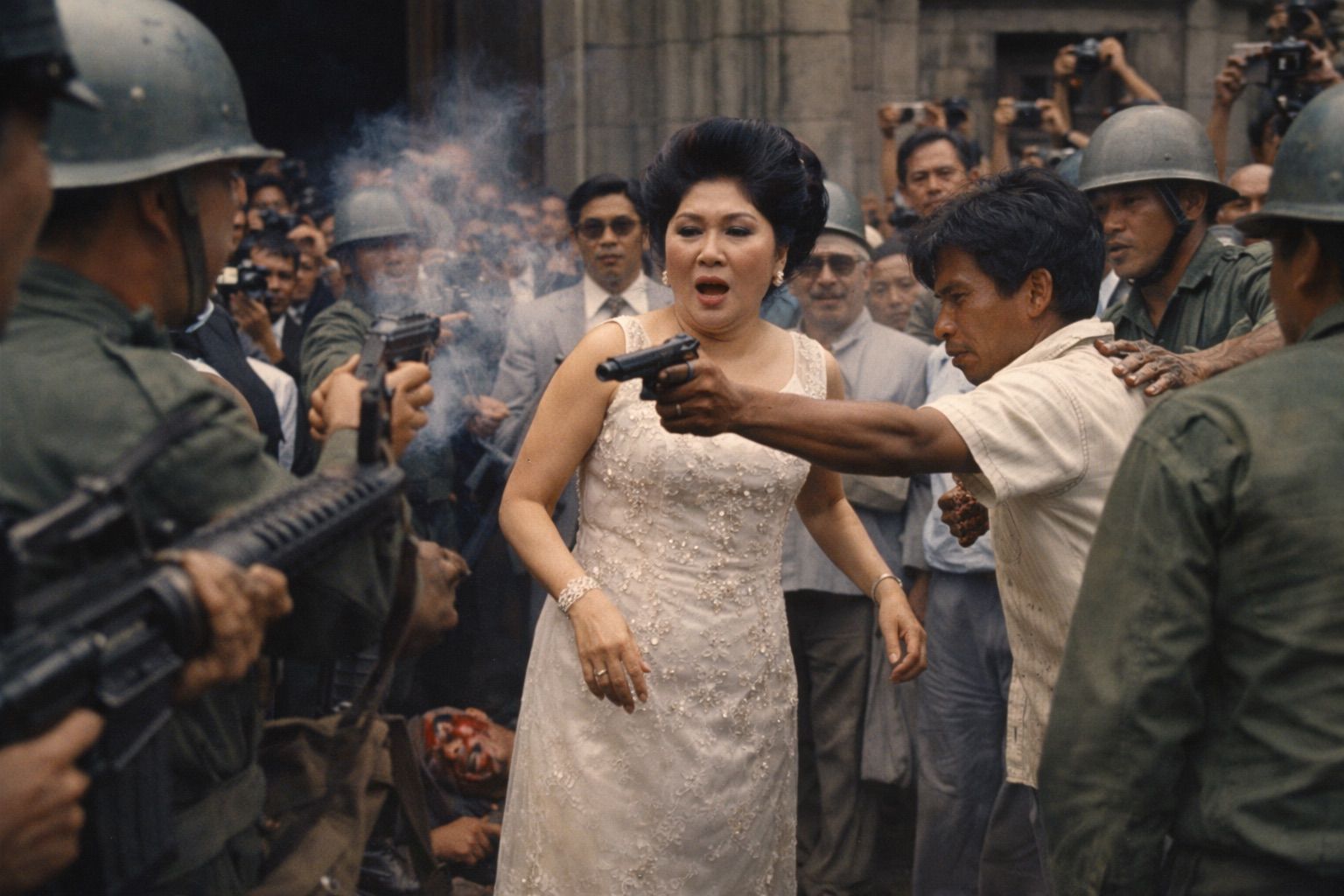 As Salvador drew closer to the President and his wife, Imelda’s guards quickly closed in around them, forming a tight cordon of steel helmets and machine guns. But it was too late – Salvador had already pulled out a pistol from beneath his shirt and was raising it towards Imelda.