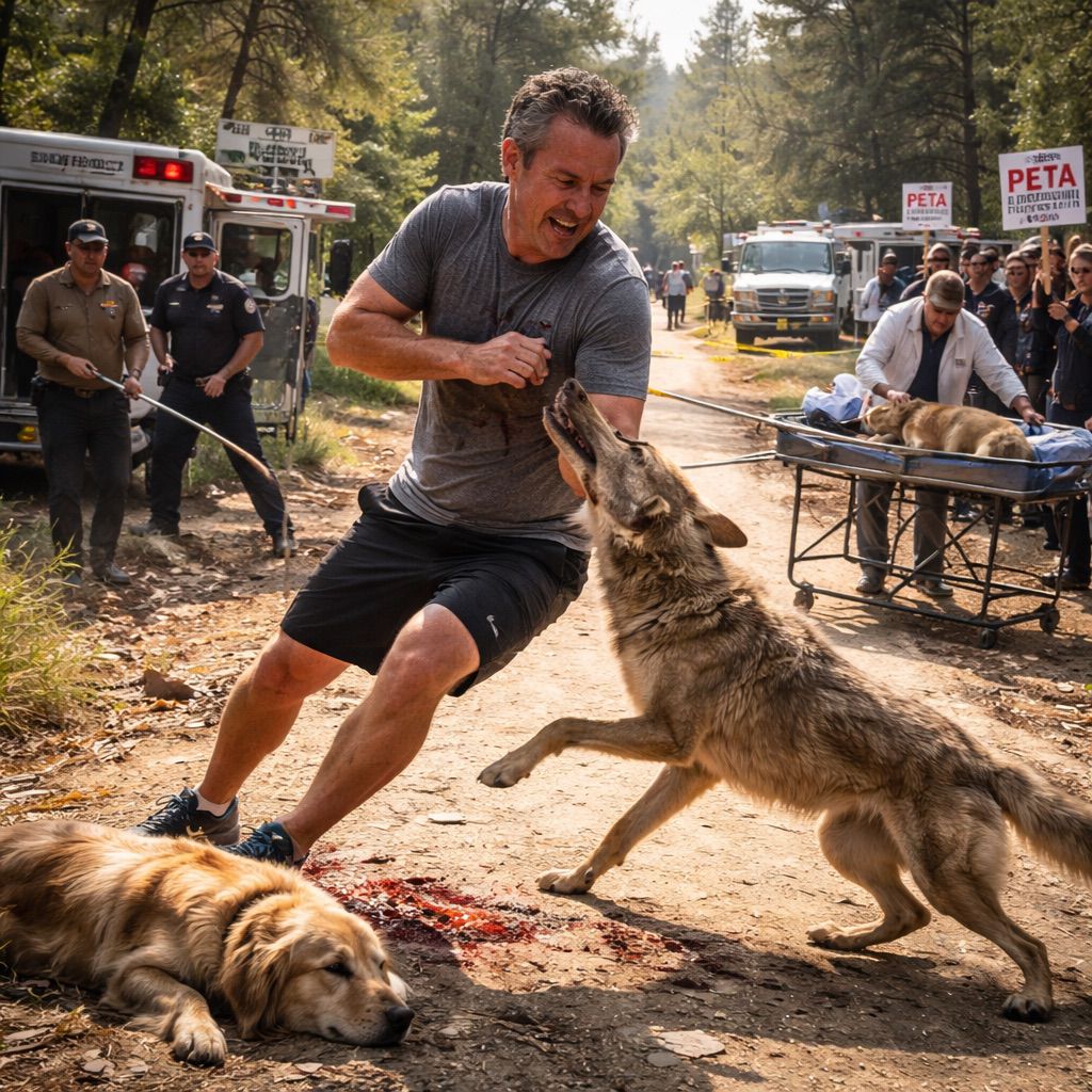 The Governor of Texas is jogging with his dog along a nature trail. A coyote jumps out and attacks his dog.