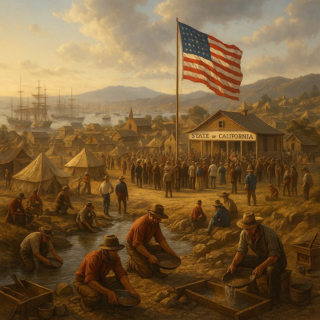When California joined the Union on September 9, 1850, it did so with the kind of drama, speed, and chaos that perfectly suited the place we now think of as the land of reinvention. In a country that was still wrestling with slavery, westward expansion, and fragile compromises, California didn’t wait politely in line like the other states before it. It came barreling in on a tidal wave of gold dust, fortune seekers, and wild ambition. The Gold Rush that began in 1848 didn’t just transform a quiet Mexican province into a bustling epicenter of global migration; it hurled California onto the national stage in record time. In just two short years, what had been a sparsely populated land of missions, ranchos, and Native tribes became the obsession of prospectors, entrepreneurs, and schemers from around the globe. The state’s sudden leap into the Union was not just about gold, though the glitter of it colored everything; it was also about power, politics, and the uneasy balance between free and slave states. To understand California’s admission is to understand the fever of possibility and peril that defined America in the mid-19th century, and to see why California’s identity as a place of extremes and contradictions was written into its DNA from the very beginning.