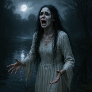 On quiet nights along Mexico’s rivers and canals, when the moonlight shimmers across black waters and the wind carries whispers through the reeds, there is said to be a sound that chills the blood of anyone who hears it. It is not the call of an owl, nor the rustle of branches, but a woman’s …