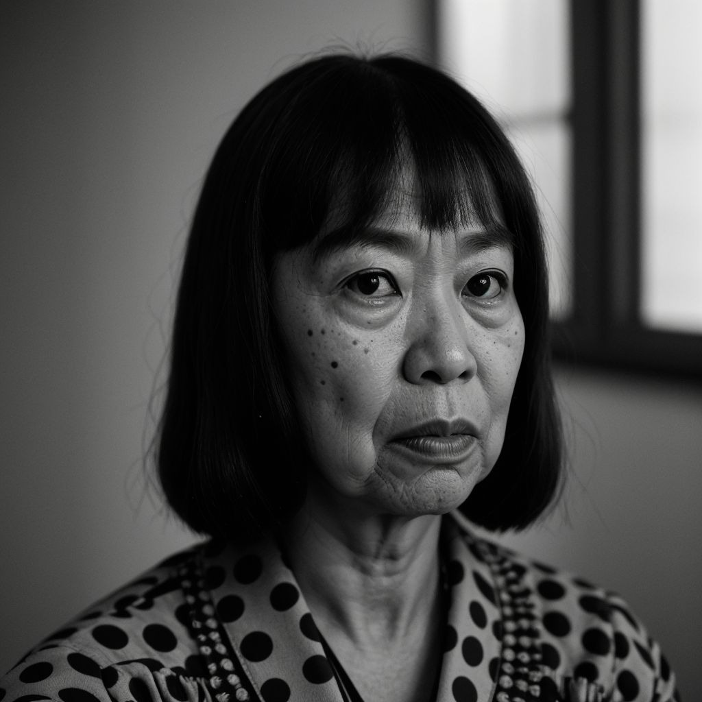Yayoi Kusama was born in 1929 in Matsumoto, Japan, into a family involved in seed cultivation and commerce. From an early age, she produced drawings marked by dense fields of repeated marks, a practice that would remain central throughout her career. Formal training began at the Kyoto Municipal School of Arts and Crafts, where she studied Nihonga painting while privately rejecting its constraints.
